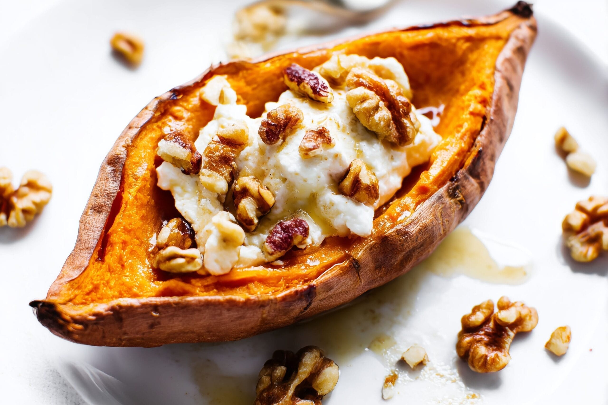 Bakad sötpotatis med getost, valnötter & honung