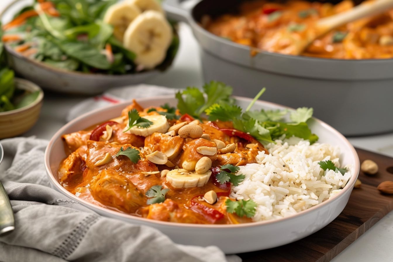 - Tillsätt bananer: Skiva bananerna och fördela dem över kycklingen i formen.