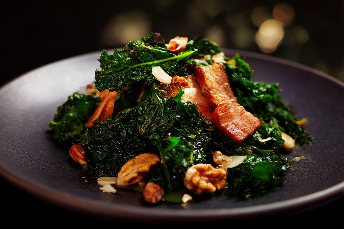 Krispig grönkålssallad med varmrökt sidfläsk och rostade nötter