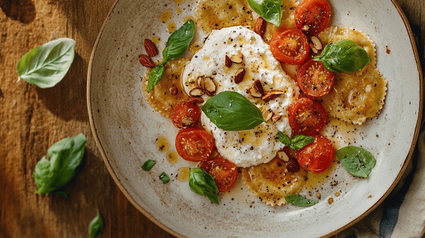 När du vill ha något snabblagat, riktigt gott och lite lyxigt – utan att behöva ställa dig och laga i en evighet – då är det här receptet svaret. Brynt smörstekt ravioli, krämig burrata och en syrlig tomatsallad med crunch från marconamandlar. Enkla ingredienser, stor smak.