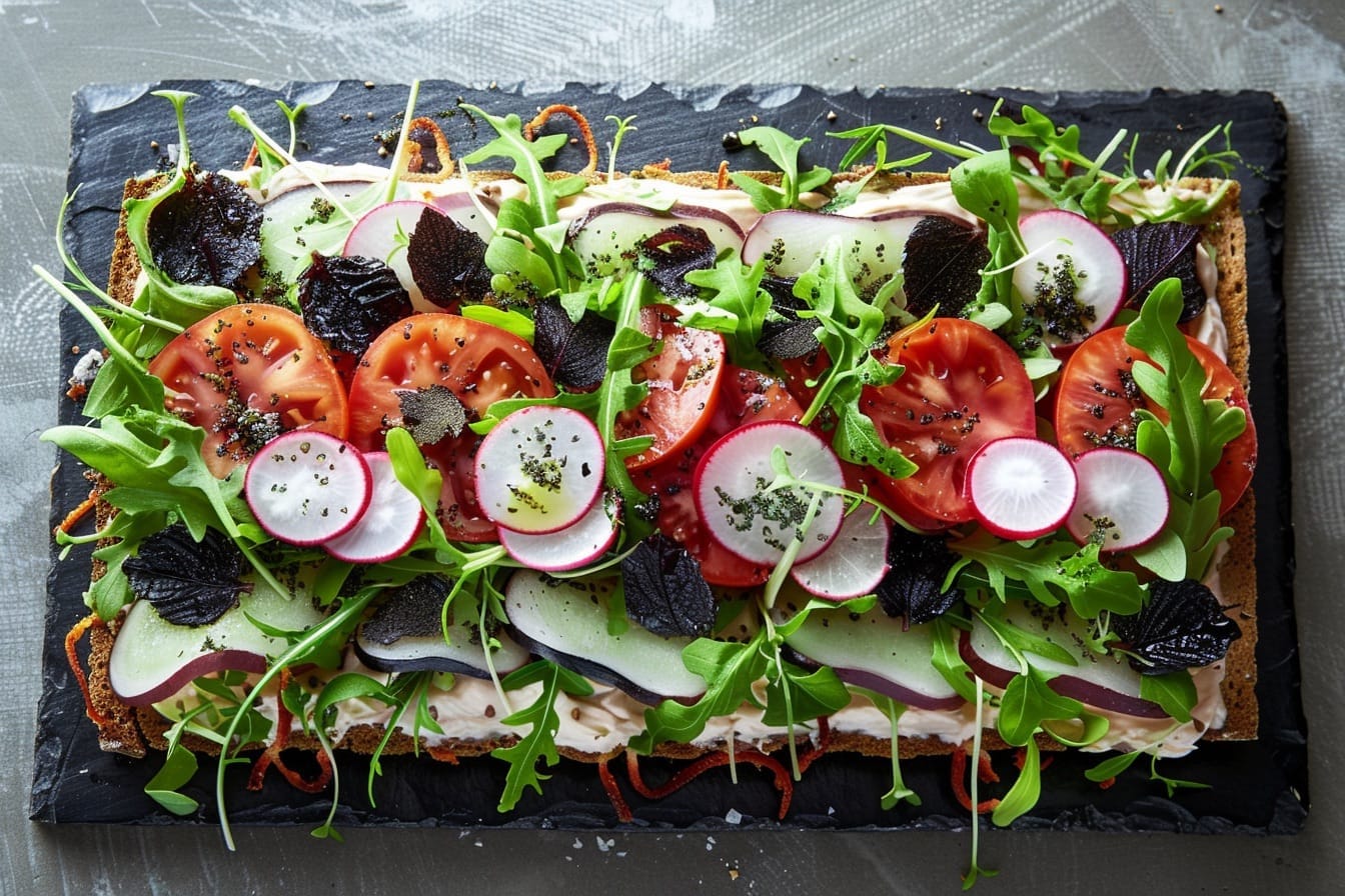 Smörgåstårtan, denna svenska klassiker, är vanligtvis laddad med skaldjur, kött och krämiga fyllningar. Denna veganska version behåller dock all den festliga flärden från originalet samtidigt som den inkluderar färgstarka grönsaker, zestiga smaker och krämiga veganska pålägg. Det är lika mycket en visuell fest som det är läckert, vilket gör den till huvudrätten på varje veganskt midsommarbord.
